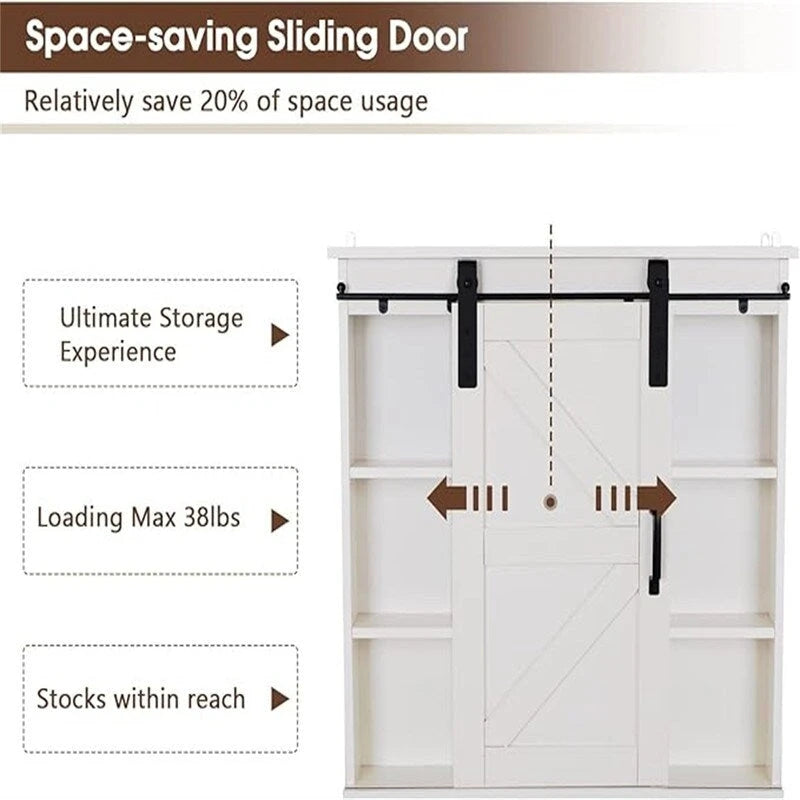 This creamy white cabinet can be placed anywhere in the room to create a warm and cozy atmosphere. Suitable for small spaces. It works well in bathroom, entryway, kitchen, living room, or laundry room. You can choose to install it on the wall or use it freestanding. The barn door of this cabinet is slide, so you can display the best that you want to show, forget the rest just slide the door over.This barn door cabinet has 5 capacious separated compartments for storage. This rustic cabinet is made of MDF and solid wood which makes it eco friendly and elegant.Top table surface supports up to 50 Ibs and shelf supports up to 30 Ibs.The sturdy farmhouse cabinet allows a long term use. This standing food pantry cabinet will easily fit in with your living room, bedroom, entryway, kitchen, and dining room. Bathroom cabinet is designed in a simple but steady structure, easy to assemble. All parts and hardware are included in the package. The detailed user manual is also included for your convenience. If you have any problems or questions, please feel free to contact us