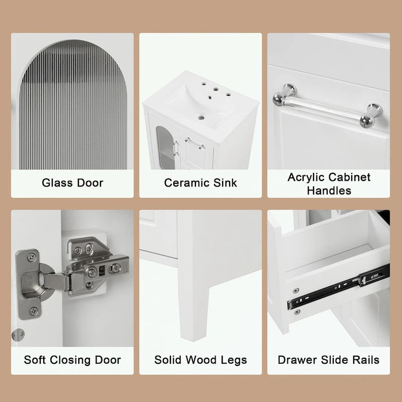 Solid Wood & MDF Board & Moru Glass: As the functional furniture in bathroom, the following materials are used for this elegant bathroom vanity base: solid rubber wood and MDF boards. Solid wood as a frame makes it strong while MDF boards are durable as well. Besides, the door is designed with moru glass, which has a hazy aesthetic feeling and adds elegant elements to your bathroom.