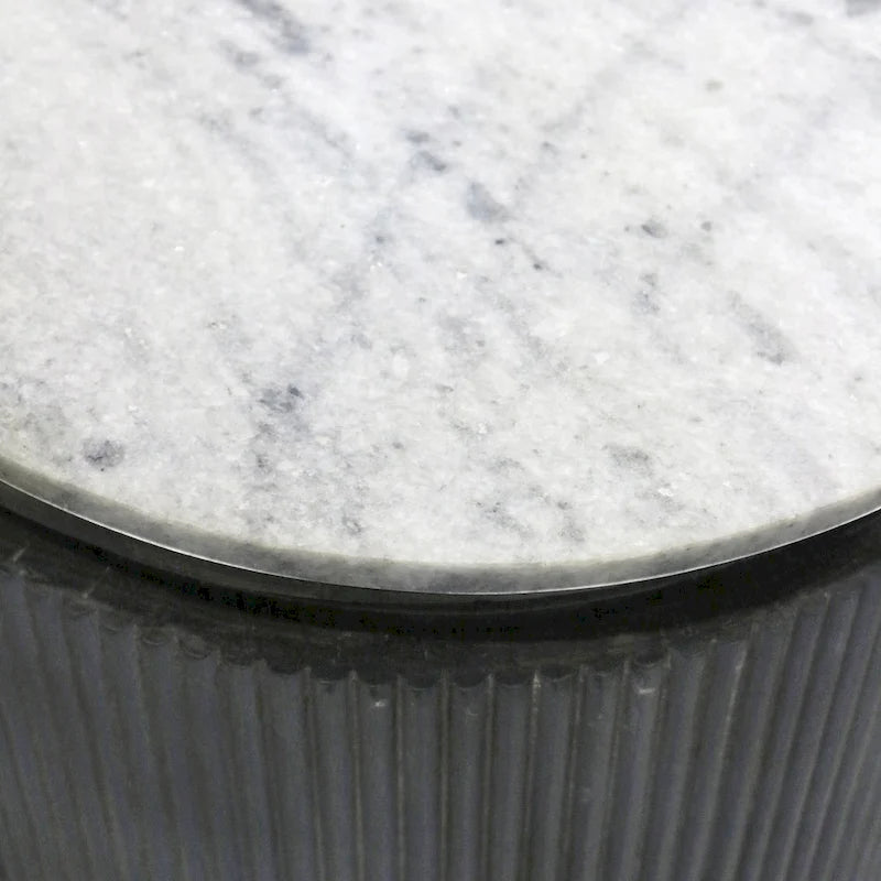 - Material: White marble table top + charcoal gray bead board wrapped body + black metal legs