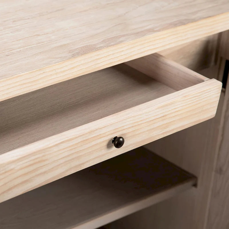 Made from solid pine wood, this stunning sideboard stretches 79 inches long. Featuring 2 sets of butterfly doors with a carved sunburst pattern that radiates from the center of each door panel. The inside features large built-in shelves for additional storage. Finished in a light warm wash finish, this sideboard will add fresh beauty to any room.