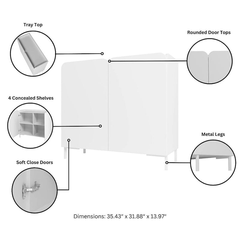 With its sleek, minimalist design, the Bogardus mid-century modern accent cabinet exudes an aura of contemporary sophistication. Crafted with clean lines and a monochromatic finish, it offers a timeless and understated elegance, making it an ideal choice for spaces that prioritize a refined, modern aesthetic. This cabinet features two soft close rounded doors with four fixed cubby shelves inside.