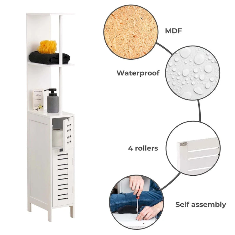Discover versatile storage with our Slim Bathroom Storage Cabinet. Designed for compact spaces, this cabinet combines style and function. First, the slim profile ensures it fits effortlessly into narrow areas, making it perfect for small bathrooms or compact rooms. Additionally, open shelves provide easy access to towels, toiletries, and essentials, keeping everything you need within reach. Moreover, the dual-door cabinet offers hidden storage to keep personal items out of sight, helping you maintain a clean, clutter-free space. Crafted from durable MDF, this cabinet not only looks elegant but is built to last. The white finish adds a modern feel, enhancing any bathroom decor. Plus, the freestanding design allows you to move and place it wherever storage is needed most, from bathrooms to bedrooms and entryways. Furthermore, this cabinet is easy to assemble, coming with all necessary hardware and straightforward instructions. In minutes, you'll add valuable storage and a stylish touch to your space. Lastly, the compact design maximizes vertical storage, making it ideal for organizing items without taking up valuable floor space. Choose this versatile cabinet for a sustainable, functional, and beautiful solution to your storage needs.