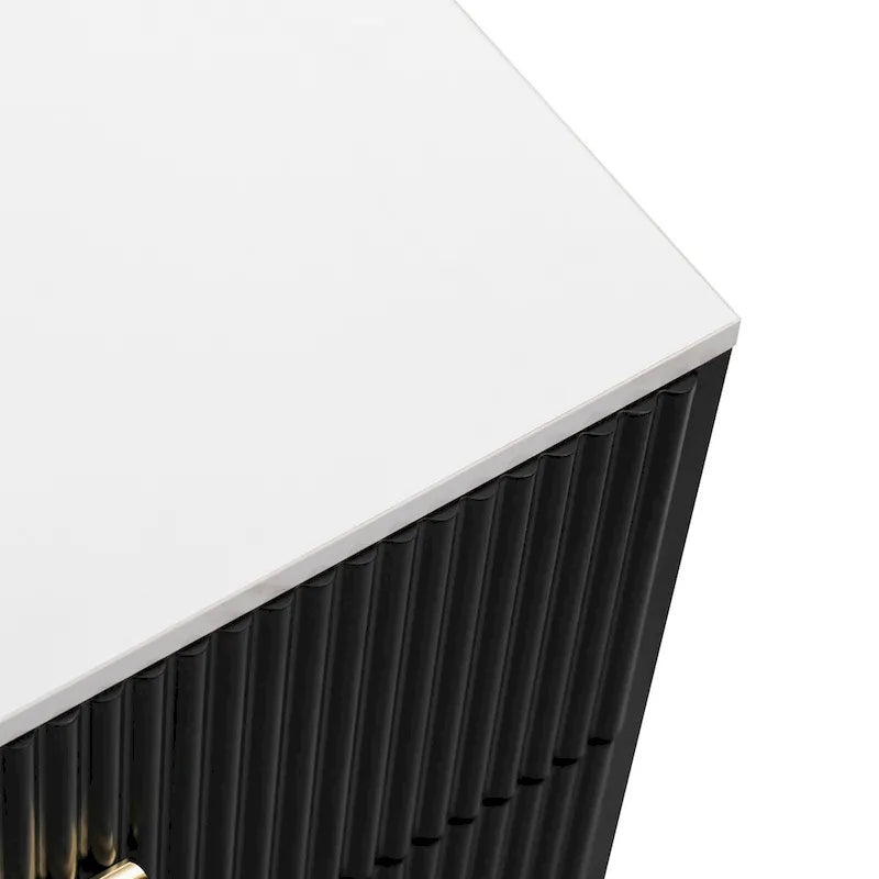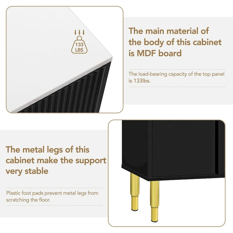 Experience ultimate versatility with our flexible storage space cabinet, featuring tempered glass doors and three convenient drawers. With four separate compartments behind the glass doors and adjustable shelves, this cabinet offers customizable storage to accommodate items of various sizes. Made from high-quality MDF, tempered glass, and metal, this cabinet is built to last. The linear concave and convex stripe design on the cabinet doors adds a touch of elegance, while the sturdy metal legs ensure stability and excellent load-bearing capacity. Plus, with plastic foot pads to protect your floors, maintenance is a breeze.