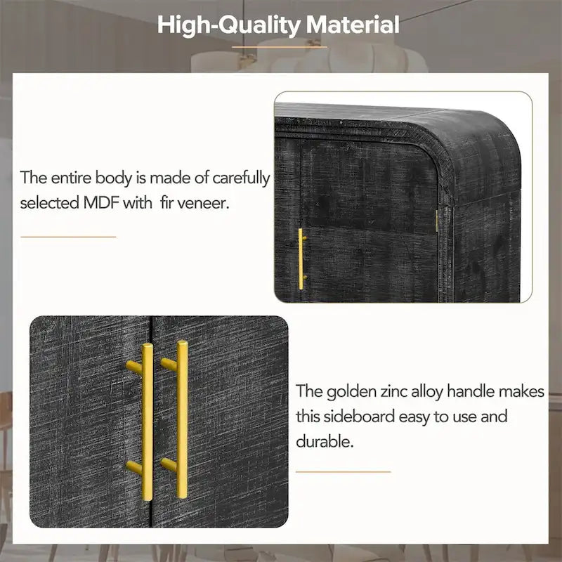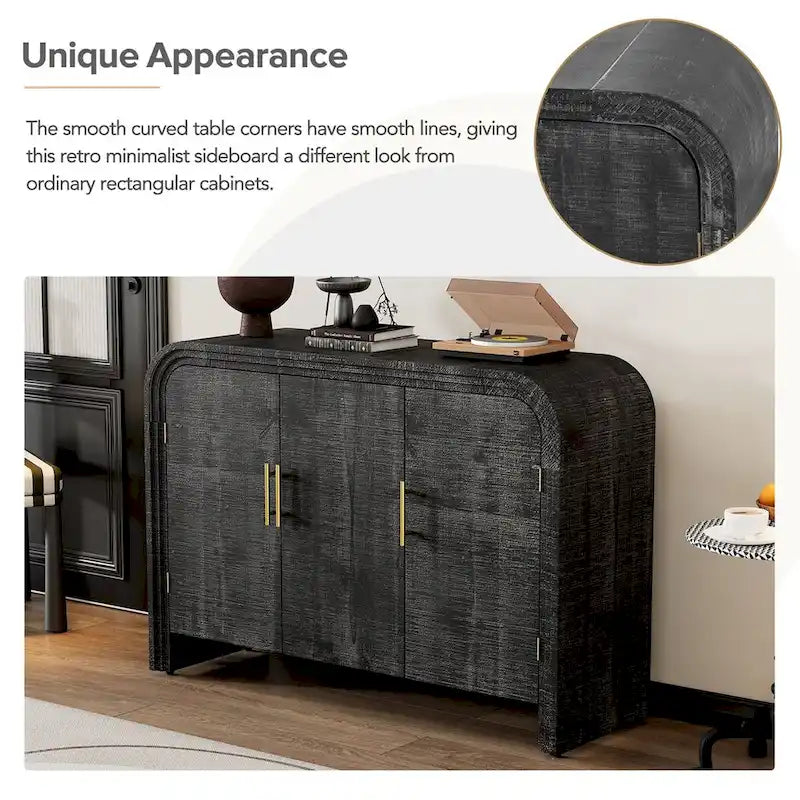 - Unique Appearance: This retro minimalist sideboard has a different appearance than ordinary rectangular cabinets. The table corners are smooth and curved, and the lines are smooth, making the overall look more high-end. The natural finish of the wood plus the gold linear pulls make this table even more elegant and sophisticated.