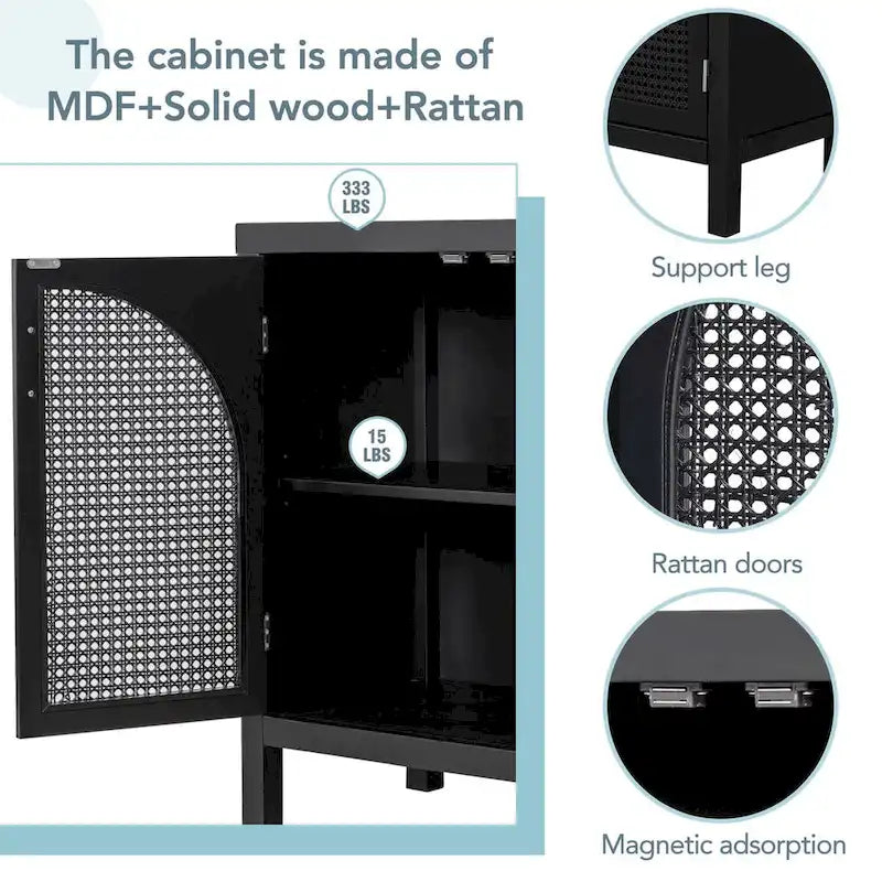 - Unique Design: Curved-shape rattan doors with hollowed-out design and magnetic closure add fashion and functionality to the cabinet.